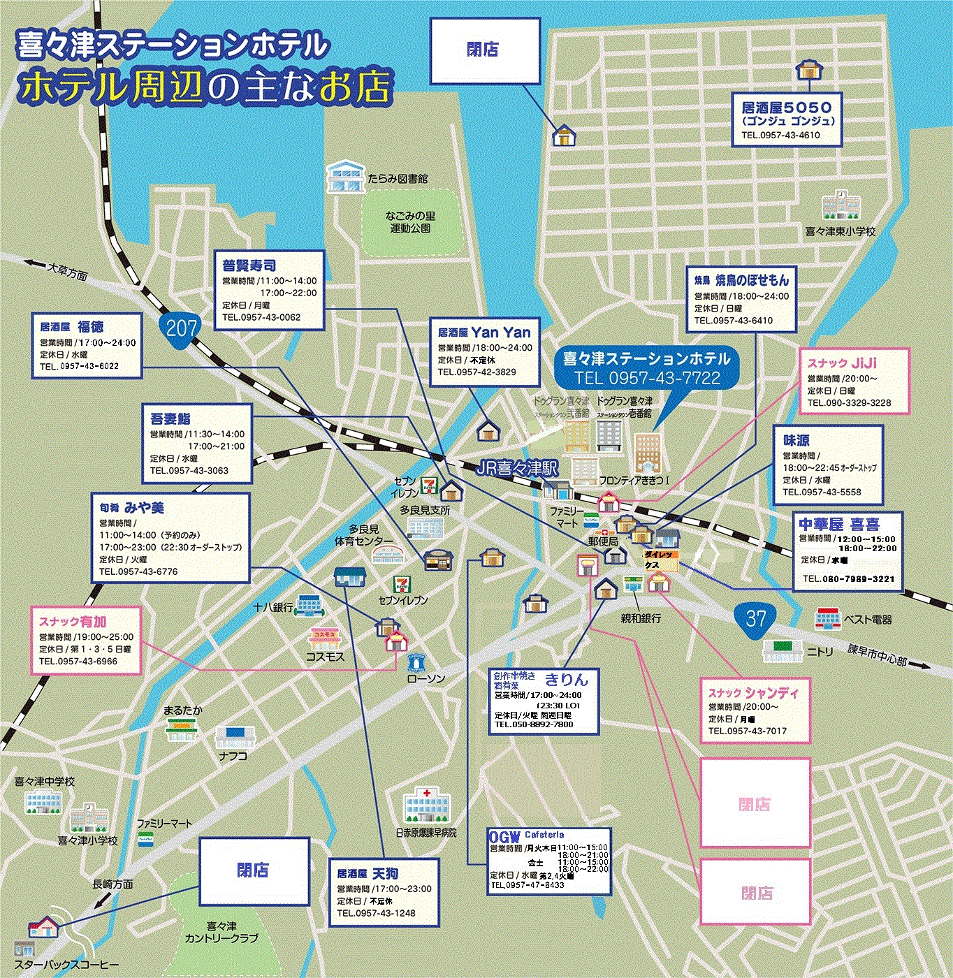 【 近隣飲食店マップはこちらをクリック 】 ホテル近隣徒歩圏内に様々な飲食店が点在。小さな町ですが、お一人様からグループまで幅広くご対応できるお店がございます。