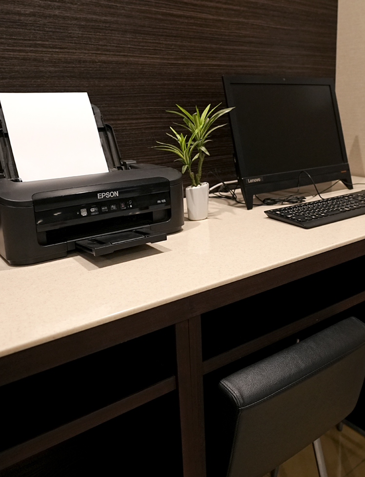ご滞在中に、インターネットのご利用や、お仕事でプリンターが活用できるスペースをフロント横に設置致しております。 パソコンは無料開放しておりますので自由にご活用ください。 プリンター使用は有料となっておりますので、スタッフへお尋ねください。