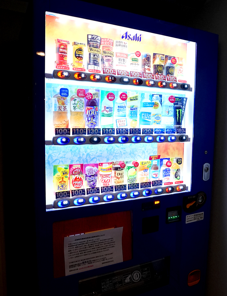 1Fロビーフロアー・5F・9Fに設置しております。 清涼飲料水のみで、アルコールは販売しておりません。 当ホテルから、徒歩3分程にコンビニがございます。(線路を横断し喜々津駅方面)