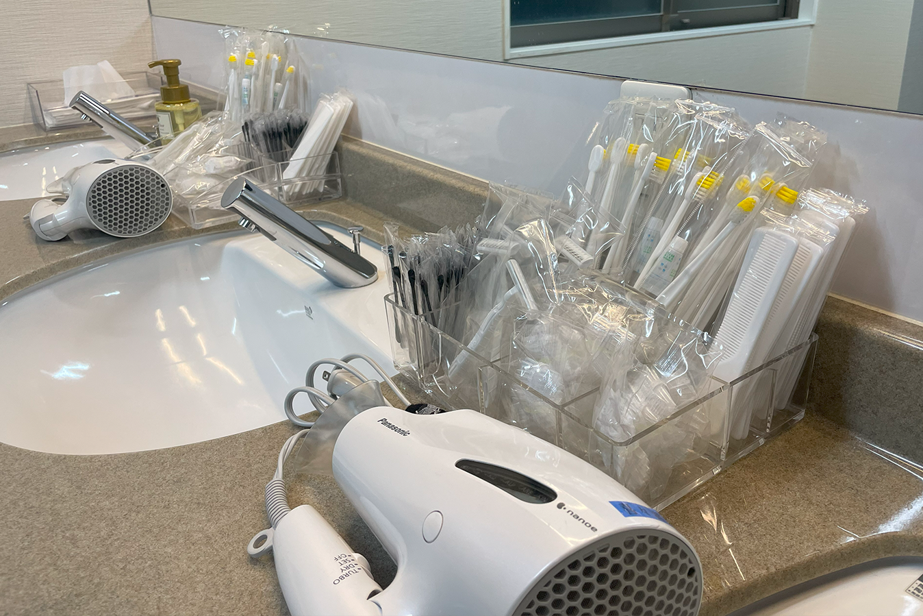 大浴場 ご利用時間19:00~23:00 サウナルームあり(男湯) 癒しの大浴場日曜日はお休みさせていただいております。 お仕事や旅の疲れを大浴場で、ととのえる 当館には、男女個別の大浴場が完備されております。 広々した浴槽で、手足を伸ばし日頃の疲れを吹き飛ばしごゆっくりお過ごし下さい。 また、男性大浴場内にサウナルームも完備しております。 男性大浴場ご利用時間:19:00~23:00 浴室・洗い場 各洗い場には、シャンプー・リンス・ボディーソープを設置しております。 浴槽は、大人10名程がゆっくり浸かれます。 脱衣所 各洗面台には、便利なアメニティ類、ヘアードライヤーを設置しております。 鍵付きロッカー完備 サウナルーム 大人4名がゆったり座れる広さです。 女性大浴場ご利用時間:19:00~23:00 浴室・洗い場 各洗い場には、シャンプー・リンス・ボディーソープを設置しております。 浴槽は、大人6名程がゆっくり浸かれます。 脱衣所 各洗面台には、便利なアメニティ類、ヘアードライヤーを設置しております。 鍵付きロッカー完備 アメニティ ご自由にお使いください。 LONG STAY ランドリールーム 長旅や、滞在ご利用のお客様用にランドリームを完備しております。 6:00~12:00(無料)|12:00~22:00(有料) ●ご利用にあたり他のお客様にご迷惑が掛からないよう時間厳守でお願いいたします。 ●時間帯によってはメンテナンス等でご利用が制限される場合がございますのでスタッフへお尋ねください。 ●1階ロビーにランドリールーム専用のお部屋がございます。 連泊清掃について 当ホテルではエコ活動推進のため、 2泊以上の客室清掃は、2日に1回とさせていただくことになりました。 ご協力のお礼としまして、2泊以上のお客様に1泊につき100ポイントを付与させていただきます。 何卒ご理解とご協力たまわりますようお願い申し上げます。 ●客室清掃を2日に1回とさせていただきます。 ●清掃がない日は、フェイスタオル、バスタオル、バスマット、歯ブラシを袋に入れてドアの前に置かせていただきます。 ●清掃受付終了は12時までです