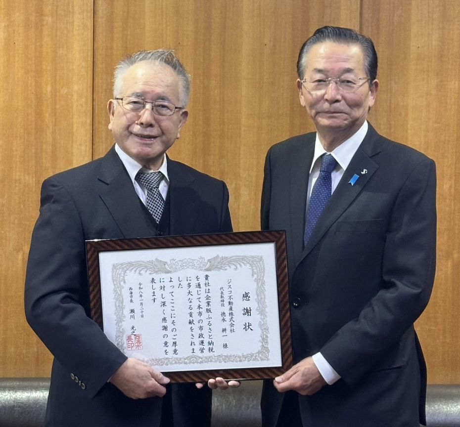 令和8年1月20日、当社は、「法人版ふるさと納税を通じて西海市の市政運営に多大な貢献を行った」として、瀬川 光之西海市長より感謝状を贈呈いただきました。