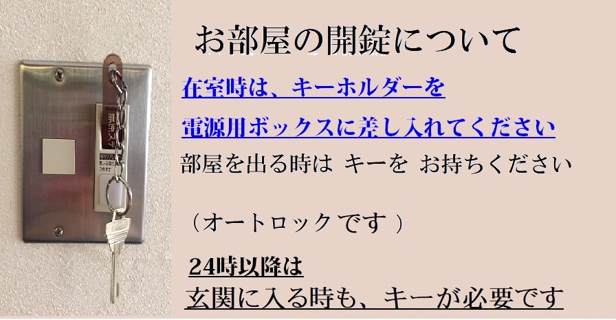 玄関および部屋の開錠はシリンダーキーで行いますが、部屋番号のプラ板をキーボックスに差し込んでください。部屋を出られる際は、必ずシリンダーキーをご持参ください。